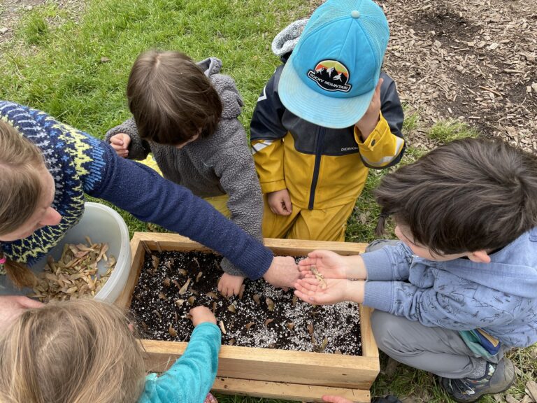 The Master Naturalists then handed the boxes off to our Forest Preschoolers, who planted the seeds in dense rows in the boxes. This quickly became a lesson about sharing space and taking turns, and an opportunity to practice fine motor skills. The seeds germinated a week later, right on cue on preschool graduation day.